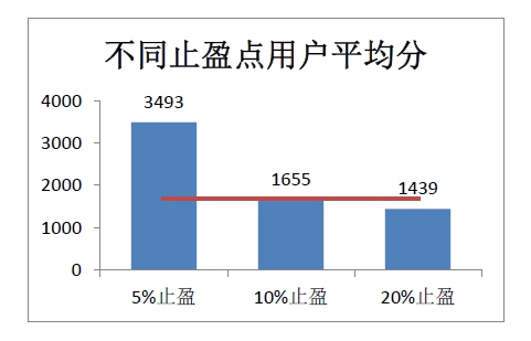 看来,选择5%止盈的恐怕都是高手——近6000次测算中只有300多选择了5%的止盈点,但这部分人的平均得分有3493分!远超总体平均1687分。