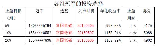 截至10月17日午间,共有4000多名用户参赛,产生了近6000条数据。收益得分前十的用户齐刷刷地选择了2015年4月底5月初的富国低碳(100056),迅速止盈,获得了近1000%的年化收益!(单笔收益8.2%,用时3天,折合年利率998%)我知道你们想说——如果上天再给我一次机会,我一定能成为首富!