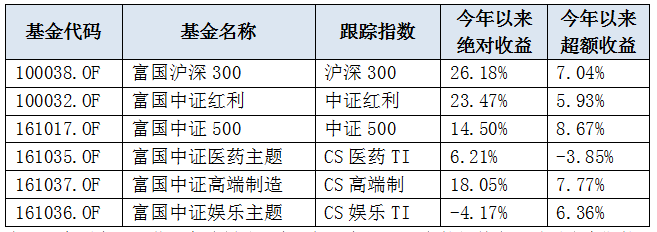 备注:富国中证医药、高端制造、中证娱乐都是刚成立的新基金,受到建仓期的影响,超额收益不稳定,剔除建仓期后超额收益可更加稳定。
