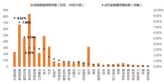 在国内一片卖出景象中,陆股通数据却显示外资正大量买入家电、食品饮料、医药等股票,并且导致外资占这些行业流动市值的比例快速提升。