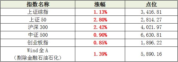 上周主要股票指数全线上涨,沪深300、上证50此类大盘价值风格指数还收获了2%+的不小涨幅。此外,上证综指突破3400点也令市场集体高潮了一番。