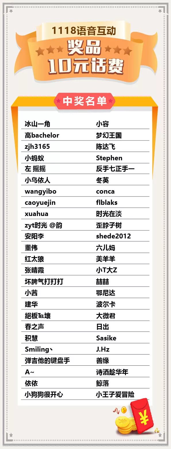 *所有中奖的话费将于11月24日(本周五)前充值到中奖客官的手机账户中,请各位客官耐心等待~