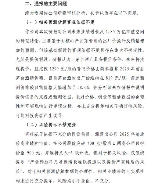 11月20日晚间,上交所发布《关于安信证券发布贵州茅台研究报告相关事项的通报函》,通报称经对近期安信证券研报审核分析,分析师未在研报中说明提价信息的来源或预测依据,未对价格、销量等预估数据的合理性和可实现性进行审慎分析,亦未充分提示相关不确定性风险,可能对投资者产生误导。