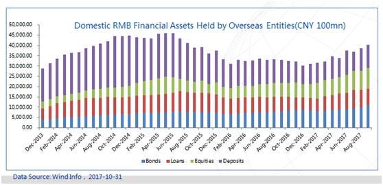 Wind数据显示,2017年前9个月,海外机构和个人增配中国A股3718亿人民币,增速57;前九个月海外机构和个人增配人民币金融资产共10060亿元,其中权益占比近37%。