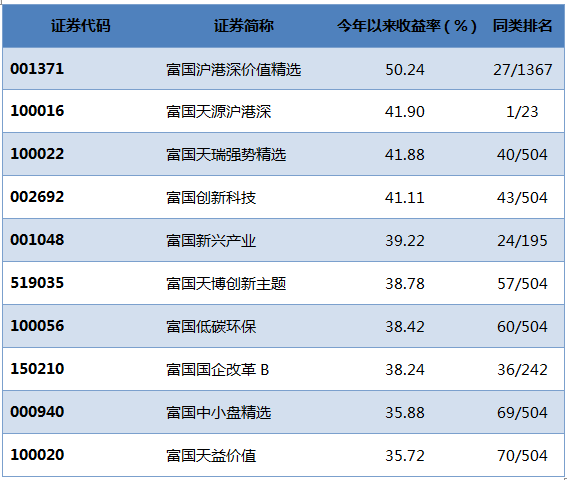 从单只基金来说,富国沪港深价值精选(001371)、富国天源沪港深(100016)、富国天瑞(100022),今年以来都达到了40%-50%的收益率。