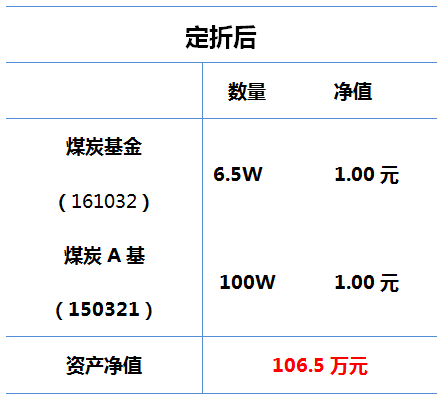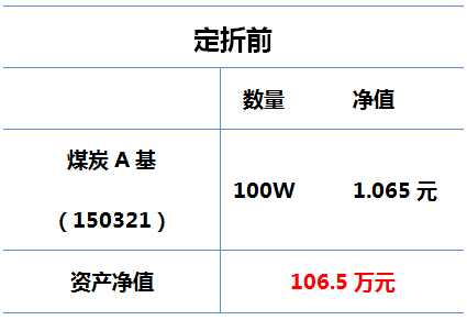 举个例子:煤炭A基的约定收益率为一年定存(1.5%)+5%,属于分级A中“票息”较高的分级A之一。明日(12月1日)其将定折。假设今天某客官手中持有100万份、单位净值为1.065元的煤炭A基: