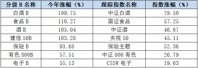 级掌柜统计了今年以来成交量居前80位的分级B的累计涨幅情况。其中,白酒B领涨,涨幅高达200%,相较中证白酒指数近80%的涨幅,收益足足翻了2.5倍。涨幅次之的是食品B,今年斩获110%,收益也是耀眼。