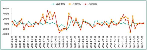 📚从统计数据来看,从2003年到2016年底,56个季度中,标普500获取正收益的概率为70%,万得全A则不到56%。也就是说,每个季度短期投资获得正收益的概率比抛硬币决定大不了多少。
