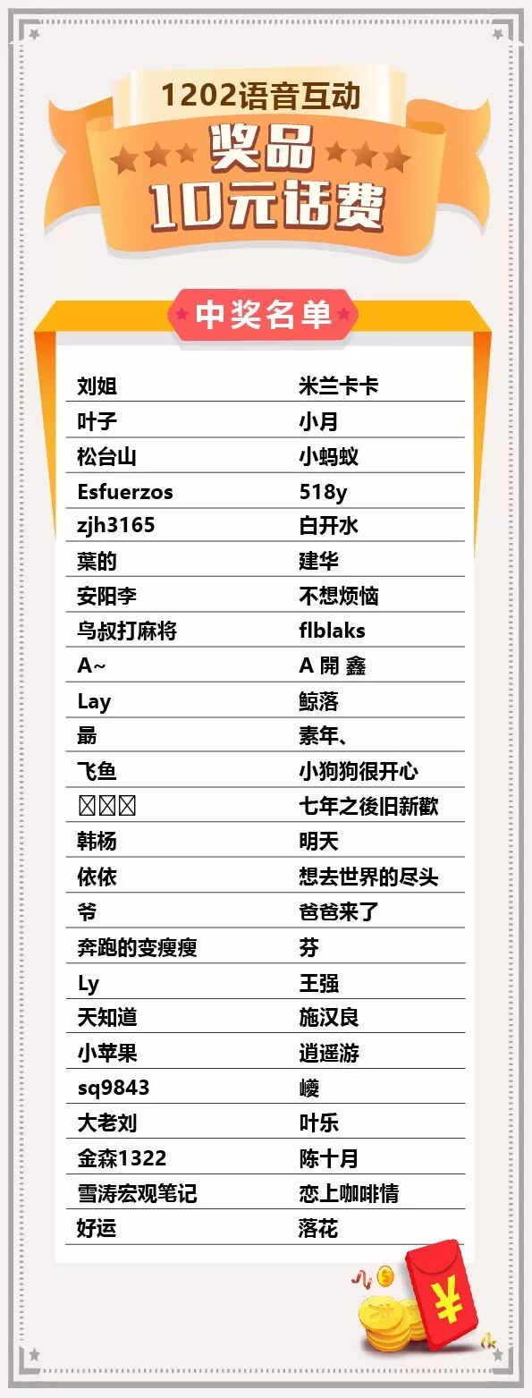 *所有中奖的话费将于12月8日(本周五)前充值到中奖客官的手机账户中,请各位客官耐心等待~