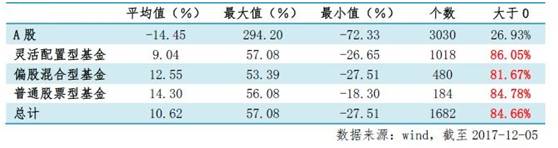 2015年7月以来,A股2768只个股中仅有482只取得正收益(次新股居多),平均收益为-23.47%,其中83%的个股尚未达到2015年6月30日股价。而1027只主动权益型基金中有44%达到或超过了2015年6月30日的净值相对高点,平均收益为-3.31%,远远好于个股的表现。