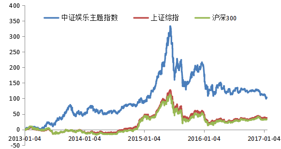 从历史来看,中证娱乐主题指数表现优于沪深300和上证综指。据wind统计显示,2013年以来至2017年1月23日中证娱乐主题指数累计上涨104%,而同期上证综指上涨37.76%。