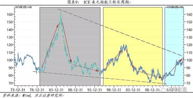 从1979年下半年开始,ICE美元指数先后经历的三轮长周期,从前两轮长周期的经验来看,美元指数走势呈现出三个特点:
