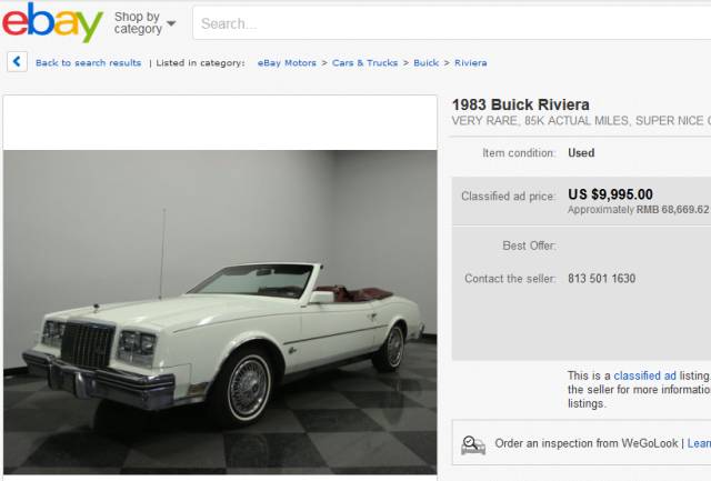 同时也不妨来看一下这辆车的市价。这是一辆1983款的别克Riviera convertible车,只有在中古二手车店才能淘到,到网上eBay一查,乖乖,连1万美金都不到。