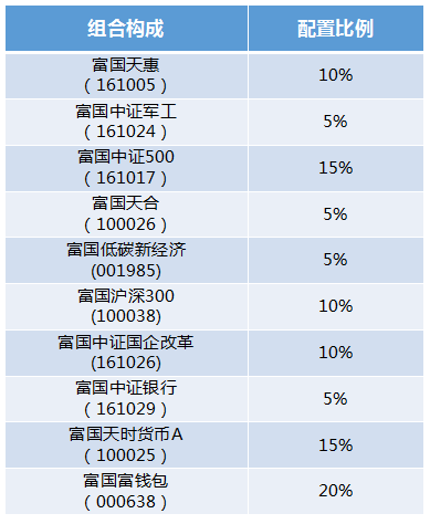 “15%中证500+10%天惠+10%中证国企改革+10%沪深300+5%低碳新经济+5%天合+5%中证银行+5%中证军工+20%富钱包+15%天时”。