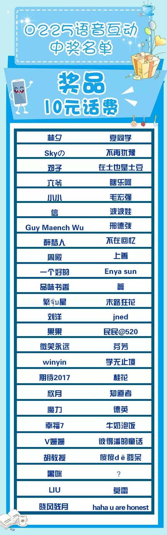 所有中奖的话费将于3月3日(本周五)前充值到中奖客官的手机账户中,请各位客官耐心等待~