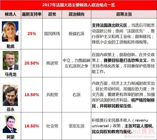 2月最新民调显示,勒庞支持率为25%,马克龙支持率20.5%,菲永支持率18.5%,阿蒙支持率16.5%。