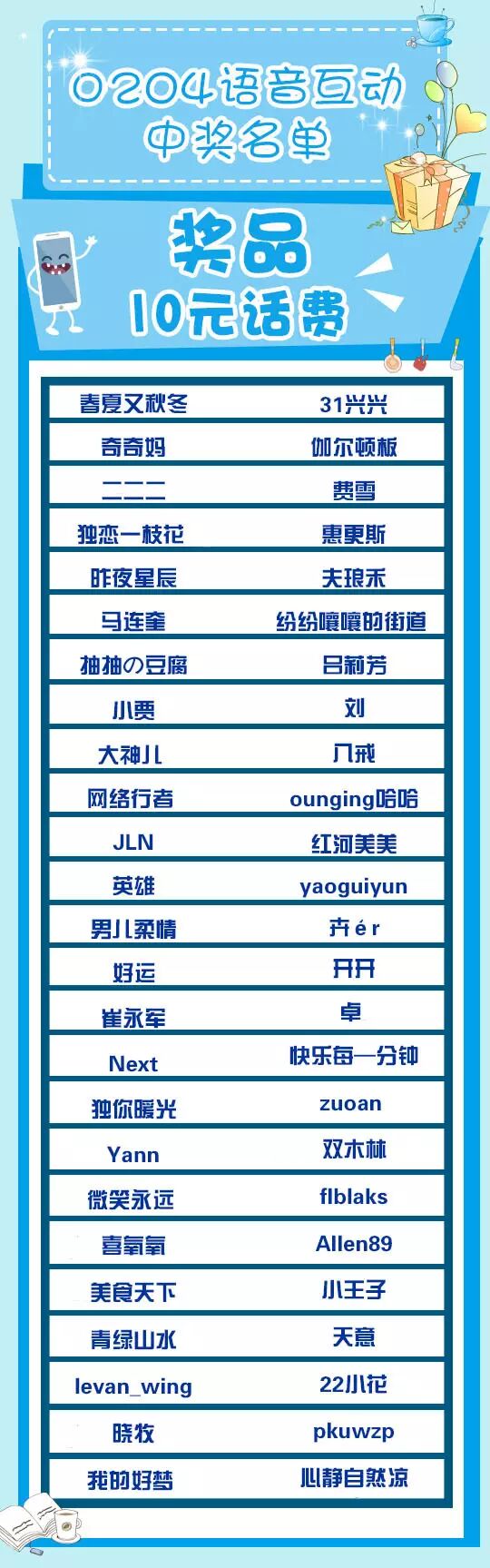 所有中奖的话费将于2月10日(本周五)前充值到中奖客官的手机账户中,请各位客官耐心等待~