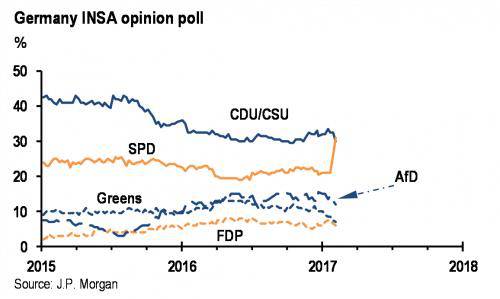 摩根大通指出,Schulz可能会是“大黑马”,以最大政党的领袖进入 “大联盟联合政府”中。可是,这位候选人大部分职业生涯是在欧洲议会度过的,在德国本土则显得默默无闻,这样的“新面孔”持有何种政治立场很难预测。