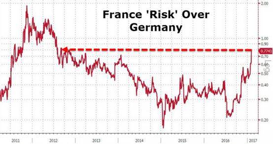 随着法国国债收益率飙升,高评级的德国国债收益率却跌至近两周低位,德法国债息差扩大至73个基点,创下2012年来最高: