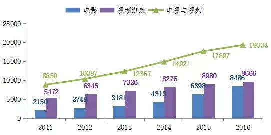普华永道的报道《中国娱乐与媒体行业展望2016-2020》中预计,未来五年中国娱乐和媒体行业年均复合增长率将达到8.8%,高于4.4%的全球平均水平。其中,电影和视频游戏会持续高增长,相应的年均复合增长率预计将分别达到18.9%和7.4%。