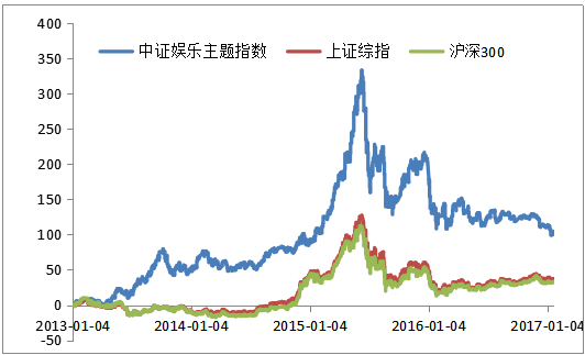 从历史来看,中证娱乐主题指数表现优于沪深300和上证综指。据wind统计显示,2013年以来至2017年1月23日中证娱乐主题指数累计上涨104%,而同期上证综指上涨37.76%。