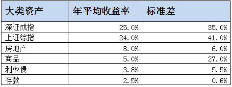 当然,所有忽略风险只谈收益的行为都可视为耍流氓,我们再来看看这几类资产的风险情况。我们用标准差代表风险,那么股市的“风险”为40%左右,高风险高收益的特点在它身上体现的淋漓尽致;风险次高的是商品(27%),只是这样的高风险在历史收益不太高的它身上显得不太划算;再次的话就是房地产了(6%)。