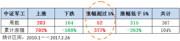 对于一些行业板块来说亦是这样,比如今年表现特别好的军工。从2010年开始算起,单周收益超过5%的共有52周,周涨幅之和达到377%!而剩下315周则累计下跌了263%。如果错过了那52周,剩下的大部分时间究竟能给我们带来什么呢?