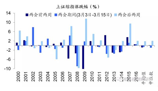 据荀玉根统计,过去15年间,两会期间和两会后两周的两个时间段内,上证综指的平均涨幅竟分别为:-0.53%、1.78%,中位数分别为:-0.84%、1.94%。也就是说,历史上的会后表现竟如此之美妙!
