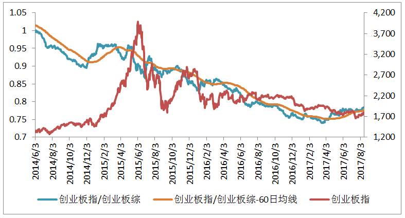 当下跟踪创业板行情的指数主要有两个,一是创业板指,二是创业板综。这两者的区别在于:前者的成分股为创业板代码前100的股票(往往代表创业板龙头的走势),后者则是创业板全部股票。而近期创业板指的走势明显强于创业板综,无论从两者的相对走势还是相对走势的60日均线来看,均呈现上升势头。
