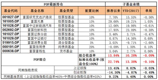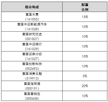 目前维持推荐组合为“15%天惠+10%富国中证新能源汽车+10%富国中证银行+10%研究优选+10%富国证券分级+10%创新科技+5%富国消费主题+20%富国信用债+10%富国富钱包”。