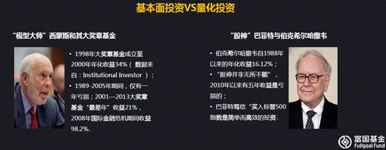 基本面和量化。刚才提到了巴菲特,这里还有一位是西蒙斯,西蒙斯是聚焦于量化的,巴菲特聚焦于价值投资,是不同的理念。不过,两位其实没有可比性,因为他俩的战场不一样。西蒙斯是基于全球各种市场期货产品的买卖,从而挖掘价格变化、走势来进行投资,当然收益已经说明一切了。