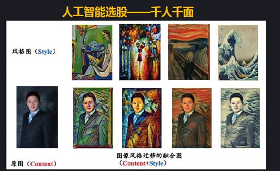 我把好股票选出来,但是用另外的策略,希望尽量结合不同特点。去年有一款网红软件叫prisma,用了图象迁移的技术,我们也使用了类似的技术到选股过程当中,大家想要什么风格就可以要什么风格。例如,第一副是毕加索的画,最后一幅是日本的神奈川冲浪里,这四张画代表了四种截然不同的风格,我们希望选股能结合市场上的风格,进行转化,更贴近市场的变化。有基本面,有机器学习和深度学习,还有市场特征的捕捉,并用迁移学习技术将风格融合到组合中去,可能是300,可能是500。实测下来,风格更加贴近之后,整个组合的走势会更加贴近市场上的变化,更加关注市场上的风格变化。同时我们也将我们的技术和GAN方法结合,做出了上面四张画和人像的结合效果,最后结果和prisma软件差不多。