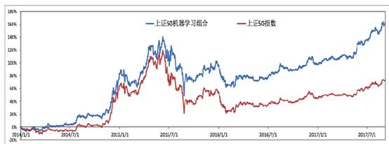 蓝色的是我们做出来上证50中选股的组合,已经超过了2015年7月份的高点。其实某个角度上来讲,50股票当中选股票是非常难的,50就是银行、非银、房地产,再加上一些核心行业,比如石化这些,这些股票是有共性。