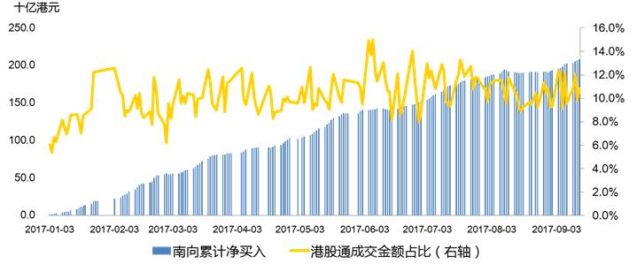 ✰ 目前恒指PE在13倍左右,在中游水平,并不算昂贵。我们也发现内地资金配置港股呈现大幅增长的态势。截止到9月14日,整体累计流入港股的资金已经达到5000多亿,而且还在进一步地流入,前一段时间我们跟一些机构投资人交流,包括保险等等,也是对港股有非常强烈的兴趣。