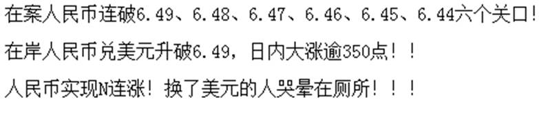 换的美元,最近玩的更是心跳。人民币的每一次破位、每一个纵身,都在一层一层一层的剥开她的心,并发出极其放肆的嘲笑。