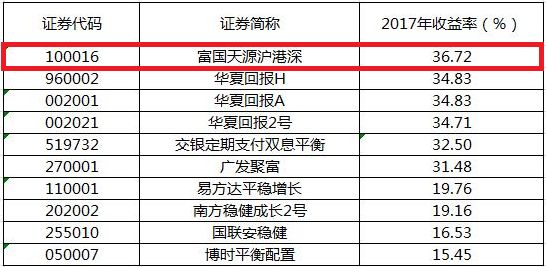 截至2017年年底,富国天源沪港深基金以36.72%的收益率,夺得同类(平衡混合型基金)冠军!