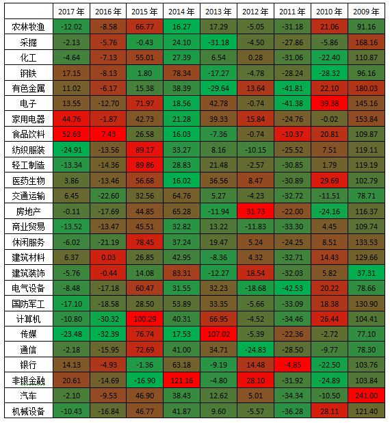 我们把股票市场按照行业表现做成了一张表,该表展示了股票行业历年的表现。颜色越红,说明该行业今年表现的越好(或者跌的越少);颜色越绿,说明该行业表现越差(或者跌的越多)。“强者恒强”在下图中意味着:今年是红色的、明年也是红色的。客官们大概扫一下便知:连着两年都是“大红色”单元格的数量比较少,连续三年“大红色”单元格好像没看到。用投资语言来说,当年强势行业,第二年大概率表现不好;连续两年都很强势的行业,第三年就没有好过。从统计规律来看,最近两年都非常强势的行业主题,客官们要小心一些了。