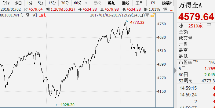 首先看万得全A指数,2017年整体涨幅为4.93%: