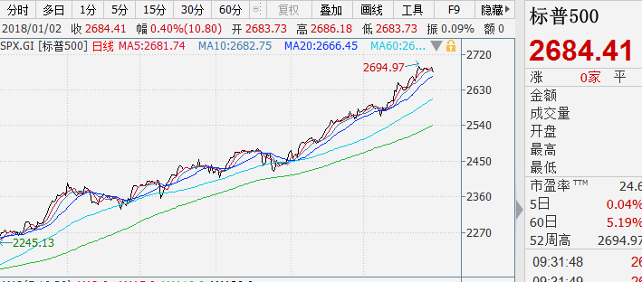 再来看,稳健得可以用来做线性回归的标普500走势,2017年整体涨幅约为19.42%: