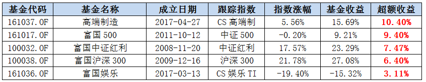 此外,高端制造取得了10.4%的超额收益、富国中证红利取得了7.47%的超额收益等等。