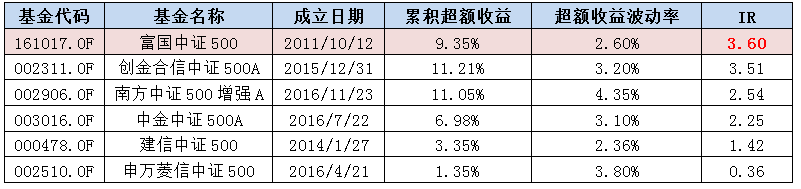 全市场共有6只中证500类指数增强基金于2017年以前成立,级掌柜统计了这部分指数增强基金的累积超额收益(日超额收益的累乘),以及日累积超额收益的波动率(代表风险),两者相除即得到指标IR。排名中,富国中证500排在首位。