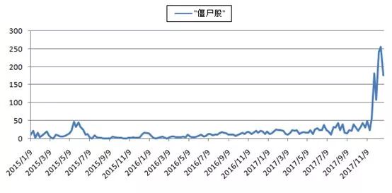 所谓“僵尸股”通常是指一些流动性差,成交量稀少,甚至长期横盘的股票。这样的股票在海外市场并不陌生,但对于A股这类散户交易活跃的市场,还真算得上是一个新鲜事!我们简单统计了上一轮牛市2015年以来,每周日均成交金额在1000万以下的股票数量(暂且把它们视为典型“僵尸股”吧)。发现了吗?2017年11月下半月开始,曲线突然有了一个急剧的拉升。从不足50只快速增加至200只以上。而这些股票又多以小市值股票为主。