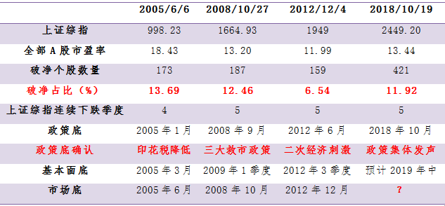在2018年10月19日,上证综指创下阶段性新低,全部A股市盈率13.44倍,“破净个股”数量达到421只,占全部A股比例的11.92%,已与2005年、2008年、2012的底部区域相当。