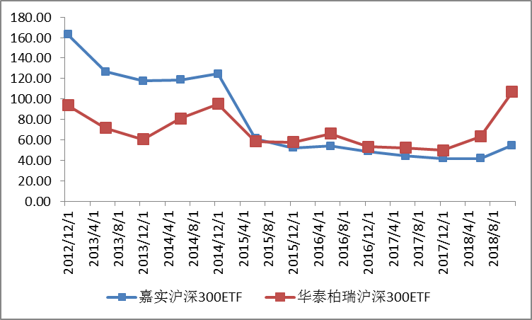 交易效率高,成交量就会天然变大,对比两大ETF的日成交量,华泰柏瑞沪深300ETF近一个月日均成交额高达8.8亿元,而嘉实沪深300ETF日均成交额仅有5000万。