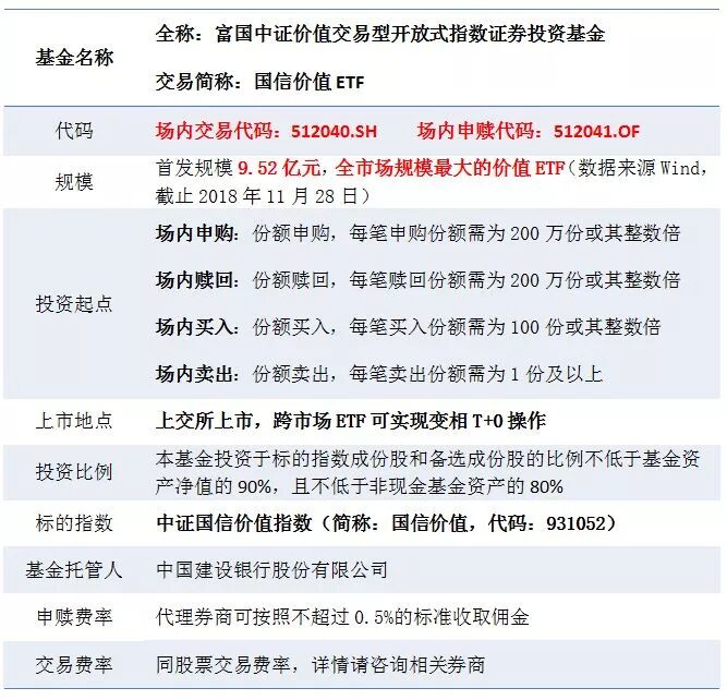 富国中证价值ETF(512040)在2018年11月29日在上交所上市。作为ETF基金,既可以场内申购赎回,也可以场内交易买卖(交易费率不高于股票交易费用)。