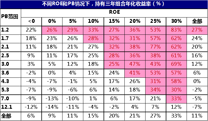 统计显示,历史上,持有不同的ROE-PB公司组合三年,投资收益的胜率和年化收益率情况。结果表明:ROE越高、PB越低,持有三年获得正收益的概率越高、年化收益率越高。因此,长期来看,高ROE+低PB,是投资收益的保障。
