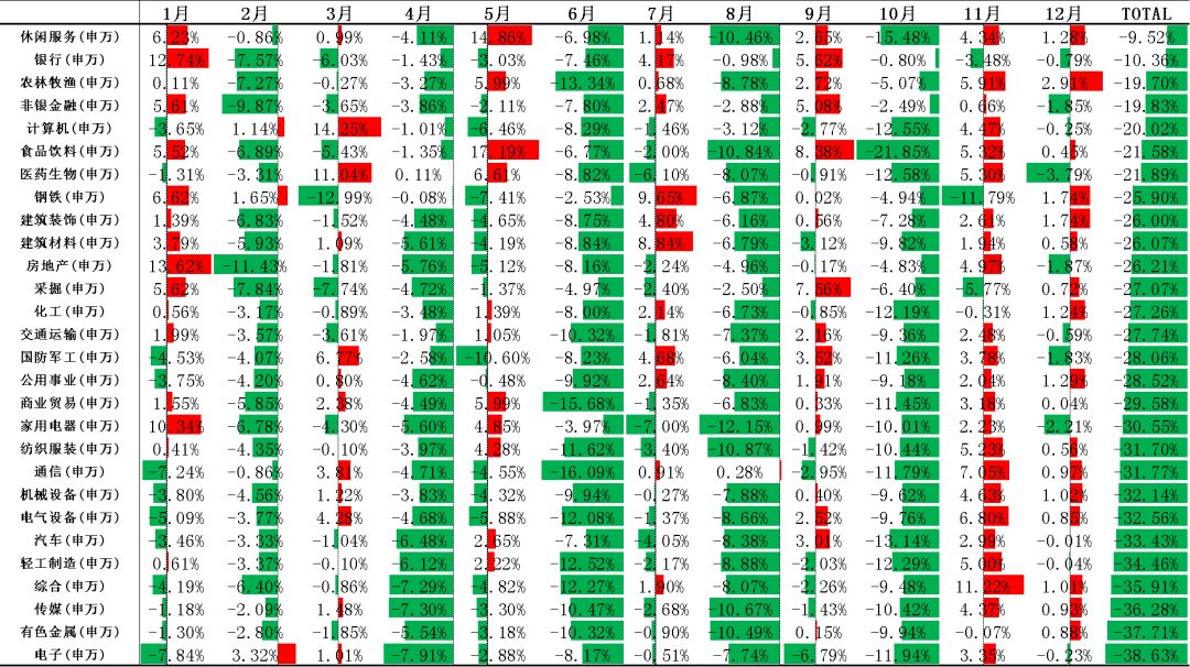 上半年主要是计算机、医药、食品饮料表现好,下半年变成了银行、非银金融、和采掘等行业。