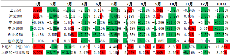 再细看一下今年的市场结构,大市值股票相对小市值股票,超额收益依旧显著。但在年头年尾(2月、3月、11月、12月),也出现了短暂的往中小创风格上的切换。