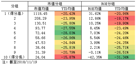 我们分别用市值和ROE对全市场股票进行打分并平均分组,计算每组股票的涨跌幅。结果表明,ROE得分高的股票,表现相对更好。