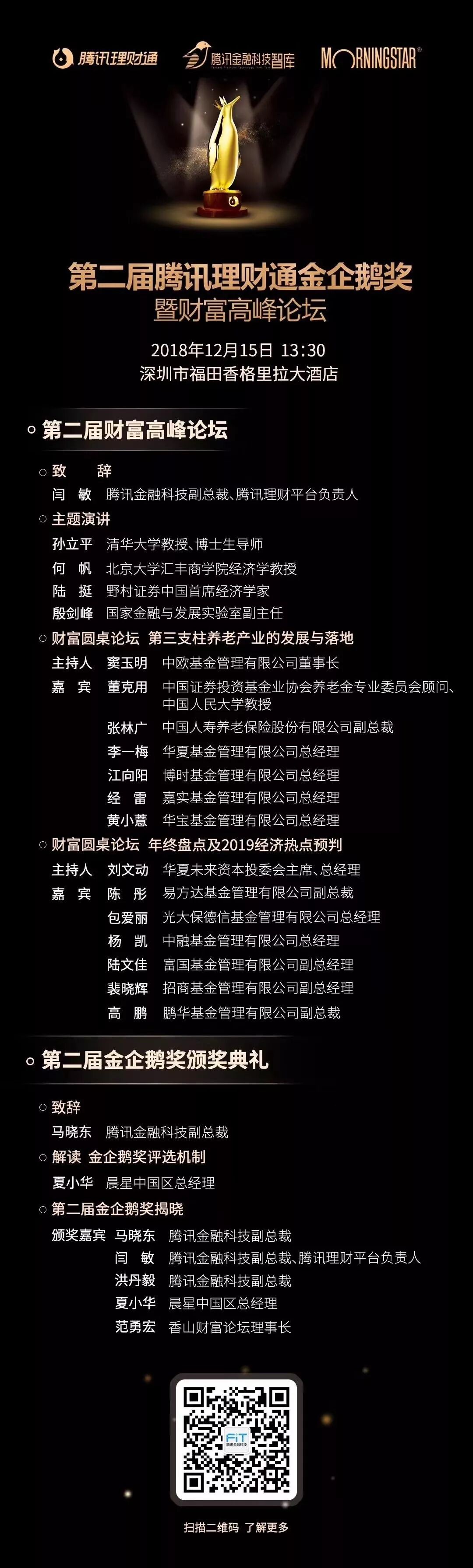 继首届腾讯理财通金企鹅奖暨财富高峰论坛成功举办后,腾讯理财通、腾讯金融科技智库联合众多合作伙伴,将于2018年12月15日在深圳举办第二届腾讯理财通金企鹅奖暨财富高峰论坛。富国基金副总经理陆文佳出席此次论坛,与多位知名经济学家、机构人士共同探讨相关领域热点。